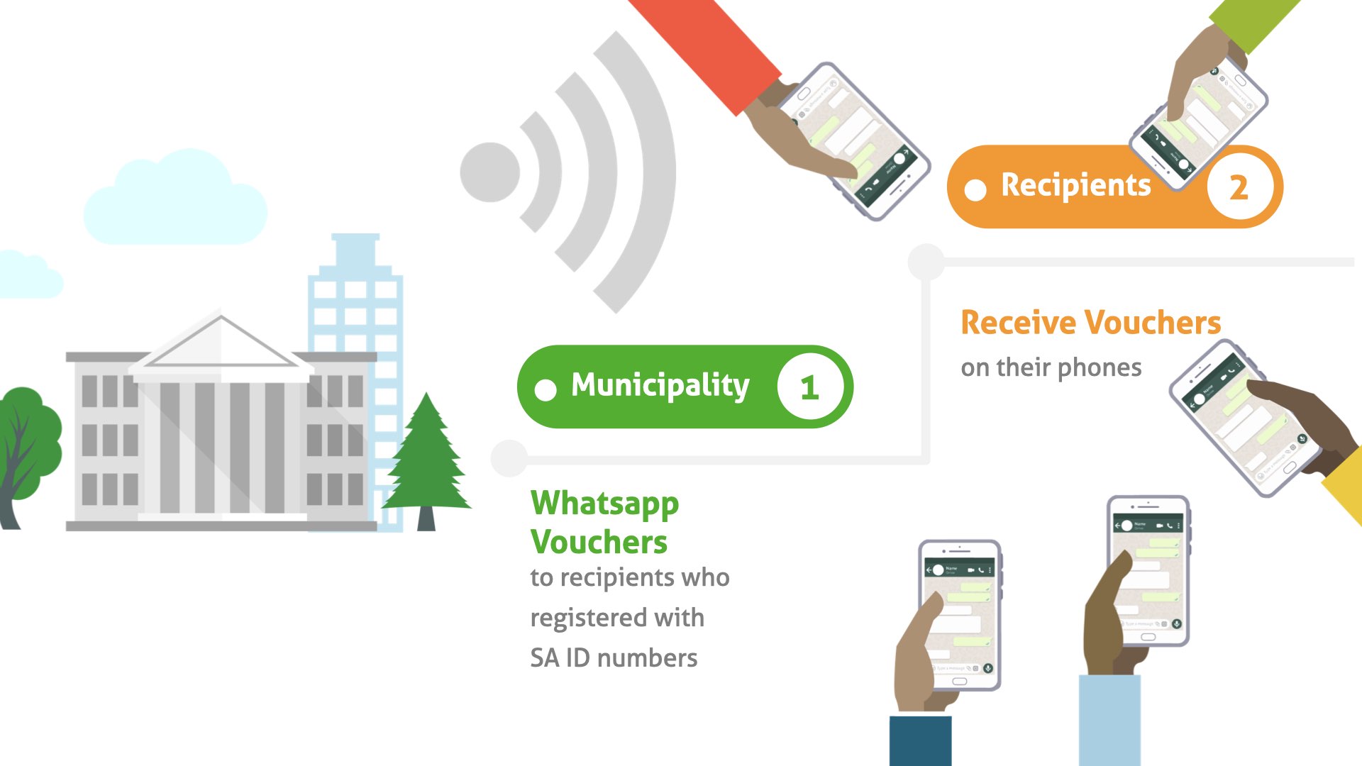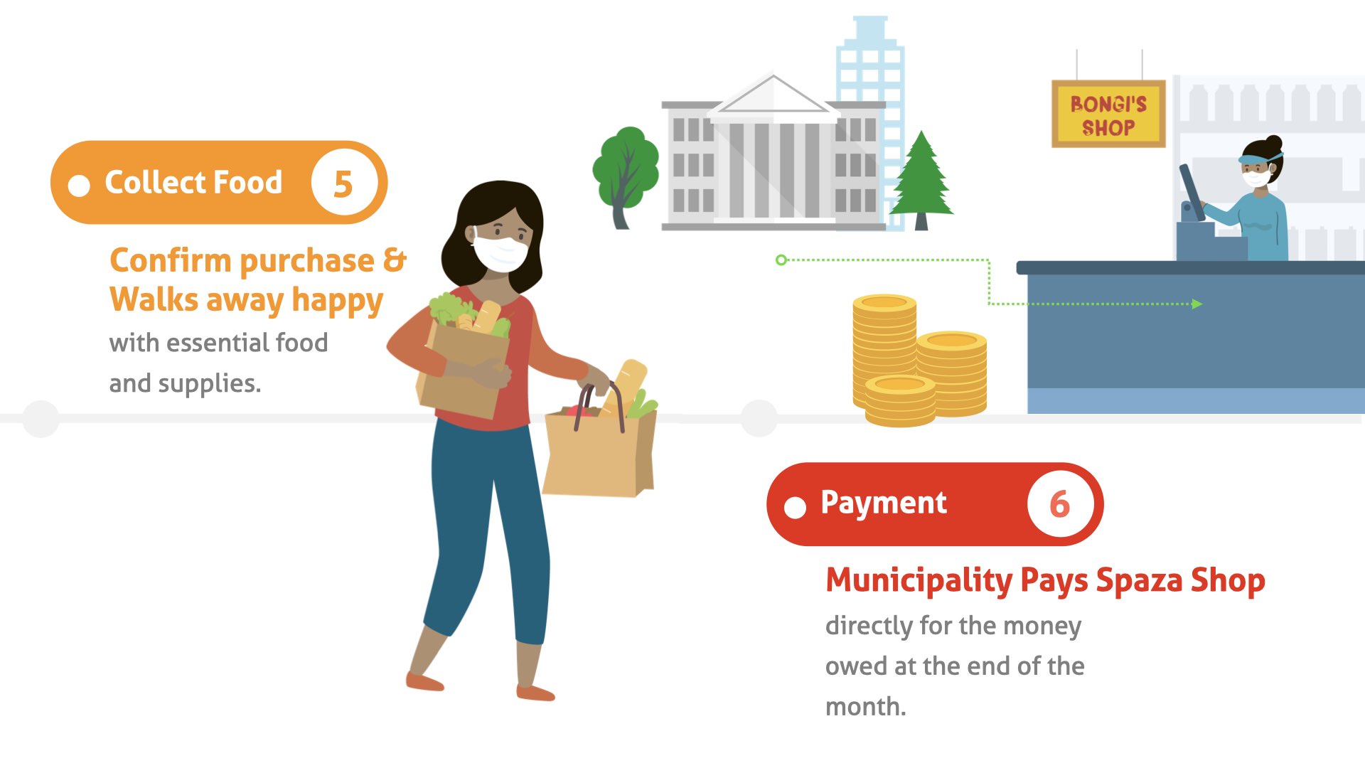 The local spaza shops gets paid directly from the municipality or system ensuring economic development within the community. System provides reporting and transparency on all transactions.