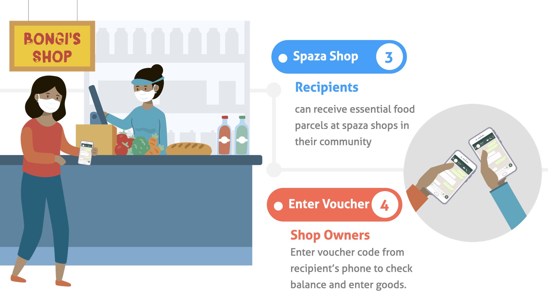 An e-Voucher is send directly to a recipient's phone. The person can collect their food parcel from the local spaza shop selecting from a list of approved items. Providing them choice and dignity.