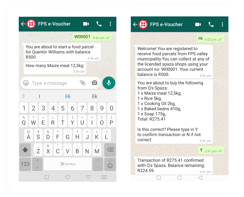 Using their ID or account number recipient can collect essential food from their local spaza shop by selecting from an approved list of items. Using Whatsapp the system securely checks their balance and approve transaction.